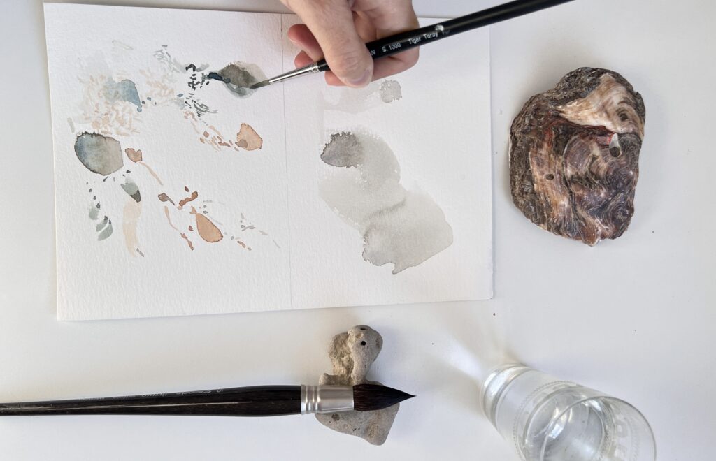 La acuarela trabajada a modo de mancha libre es, como su nombre lo indica, una técnica fluida. Es ideal utilizar pinceles de carga, suaves y de números del 12 en adelante. Se trata de dejar que el agua y el pigmento hagan lo suyo, creando formas y texturas impredecibles y orgánicas. Para esto es necesario que controles tu deseo de manejar la pintura, esperar….